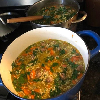 Add broth, pasta, and meatballs and bring to a boil and reduce to a simmer and cook for ten minutes or until pasta is tender. Add chopped spinach, mix in and remove from heat.